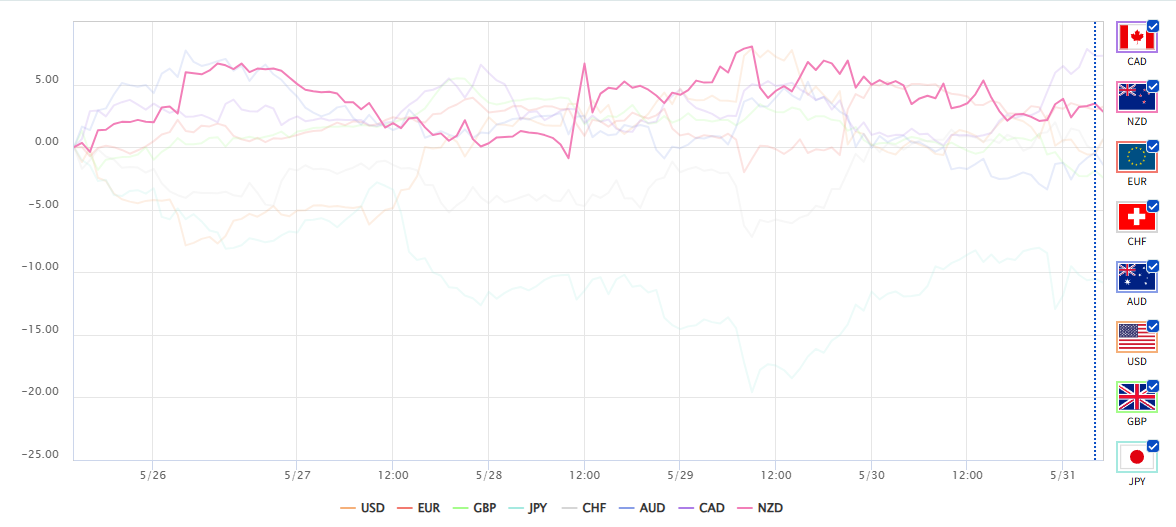 今週は月曜日から米国の経済指標が異常なほどハイスコアをたたき出したため、ドル円が一気に円安へと動き出しました。その影響を受け、週足で上から抑えていたトレンドラインを抜けていくといった状態となりました。筆者はその時、この指標にこれほど価格を押し上げ続ける力はあるのか?と疑問を抱きましたが、やはりその不安は的中し、そのご価格はトレンドラインの内側へと戻ってきました。やはりこのトレンドラインを抜けるにはまだもう少しの時間と、さらに大きな経済イベントが必要なのかもしれません。加えてOANDAさんの世界主要通貨の強弱を確認してみても、特に資源国通貨が強いというわけでもなく、欧州通貨が強いというわけでもなくといった状態が続いております。しかも我らがポンドと円の位置が下位でさまよっているという点も価格の変化が少ないという理由となっています。
