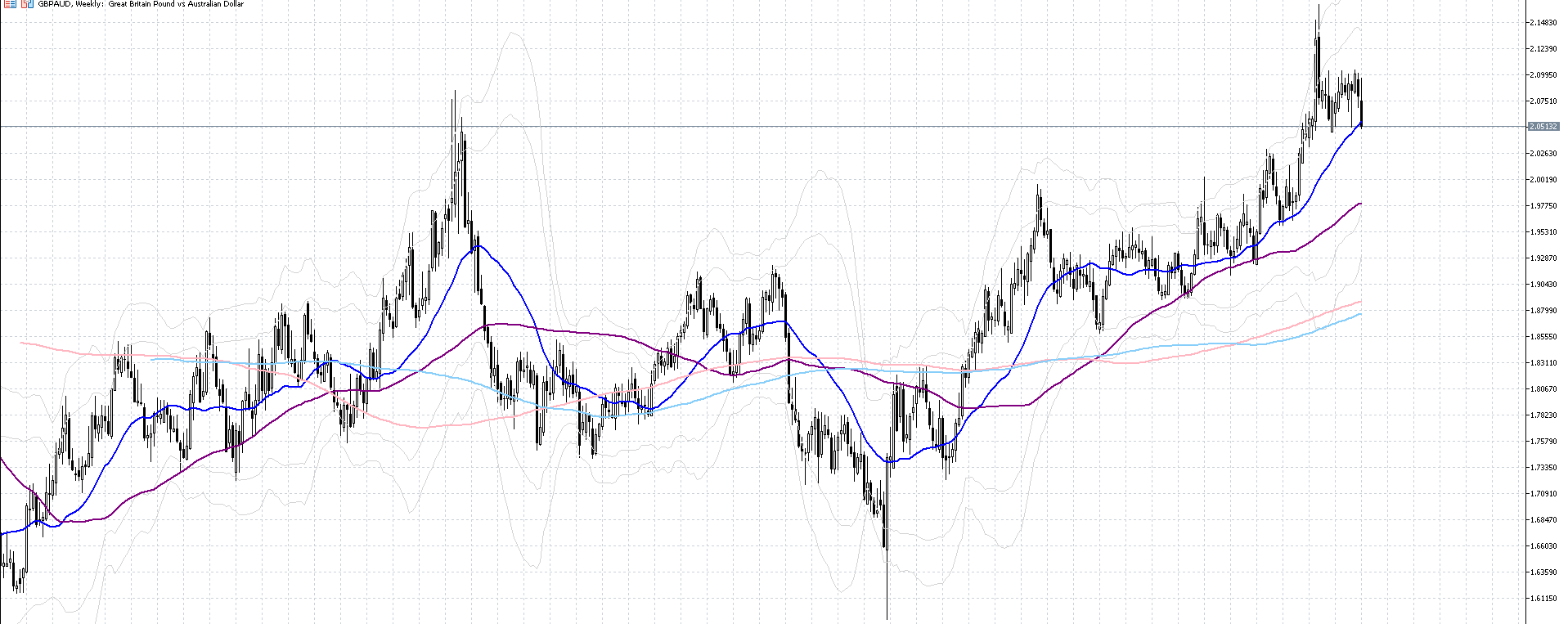 ポンドオージーは下落を続け、またしても直近安値まで下落しました。このところの安値は今回で三度目ということでトリプルボトムの形成なるか?ということが気になります。また週足で見てみると青い25SMAまで戻ってきて止まっているという感じです。ただ今回はその下の紫の75SMAまでの距離が結構あるので、来週はさらに深い押し目的な下落が続くかもしれません。