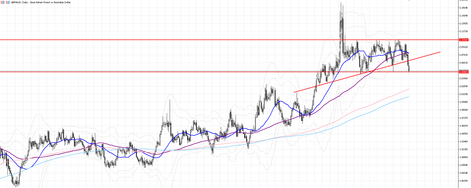 いま現在の価格である2.05辺りがサポートラインとなっているのであれば、今回の下落の元となった2.08辺りからのFibo61.8辺りに存在する直近過去の安値くらいまで上昇する可能性が考えられます。またこのサポートラインが突破されるのであれば、次のサポレジ転換線である2.03辺りまで下落するかもしれません。そこは下から追随する日足の200SMAが到達してくるであろう地点で、そこが次のサポートとして機能しそうです。