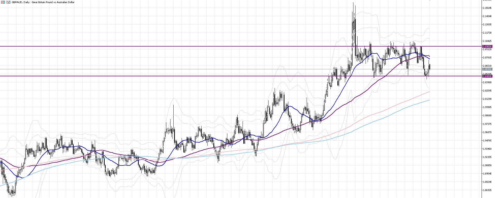 先週は大きな下落に見舞われたポンドオージーでしたが、今週は一旦上昇基調となりました。日足チャートでは2.04辺りに大きめのサポートラインがあるようで、この点で一気に上昇という形となっています。このラインは過去長い期間もみ合った末レジスタンスラインからサポートラインに切り替わった線となっているため、かなり重要なラインと言えそうです。