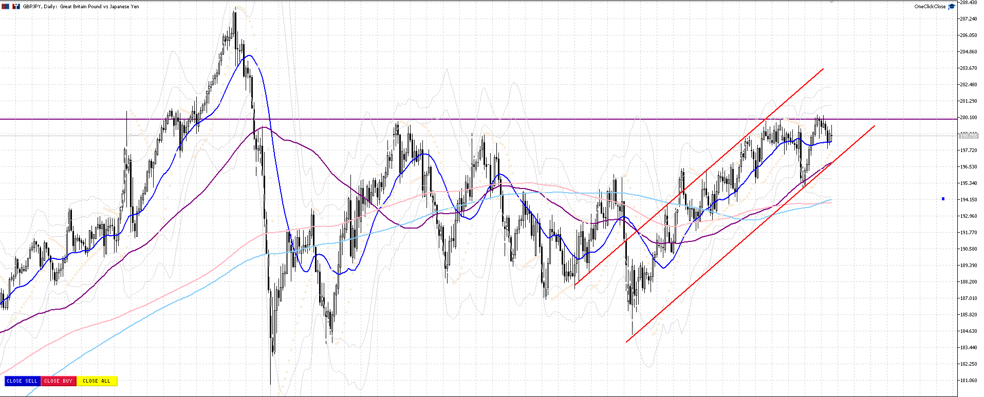 欧米は8月というと「サマーバカンス」の最中となり、お休みの従業員や企業が多くなりやすい傾向があり、当然市場も値動きが乏しくなります。今週は週明けから一度半ばに大きく下落したのですが、日足75MAにサポートされ見事に再度高値を狙うのかと思いきや、これまでずっと阻まれていた199.5円当たりのレジスタンスで跳ね返されて日足20MAで改めてサポートされ現在また同じような位置に跳ね返されている状況となっています。また、ポンドが非常に勢いが弱いため、この195.5円を超えて伸びるという風には思いにくいのが現状です。ただよく見ると、きれいな「逆三尊」を形成しているようにも見えるため注視は必要です。