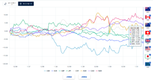 外為どっとこむさんのIMMポジションを見てみると、ドル円ペアは相変わらず円が売られている状態が続いているのがわかります。またOANDAさんの通貨強弱チャートですが、ドルもポンドも円も今週は弱さが目立っているようで、資源国通貨が上位を占めている状況です。