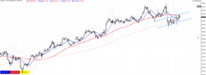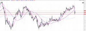 先週の急落により、一段階下でレンジ相場を形成していたポンド円ですが、4時間足を見てみると、一週間かけて綺麗なエリオット波動を形成しているようにも見えます。200MAに支えられて更なる下落は耐えているように見えますが、上から75MAが抑えている形状にもなっています。週明け、日足では20MAを超えることができるのかどうか。日足のMACDは勢いが弱まっている形状にもなっています。またさらに週末にはGOLDが一日でかなり下落したため、その影響は市場にどのような影響を与えるのかも注目が必要です。