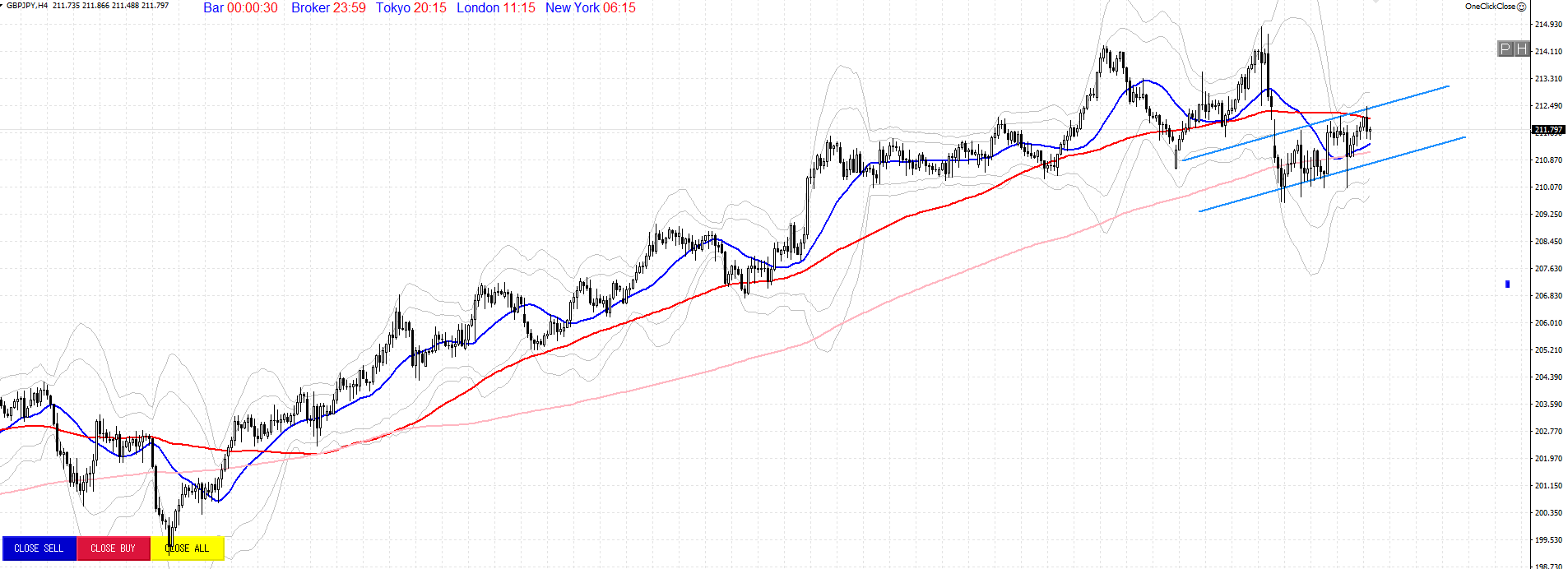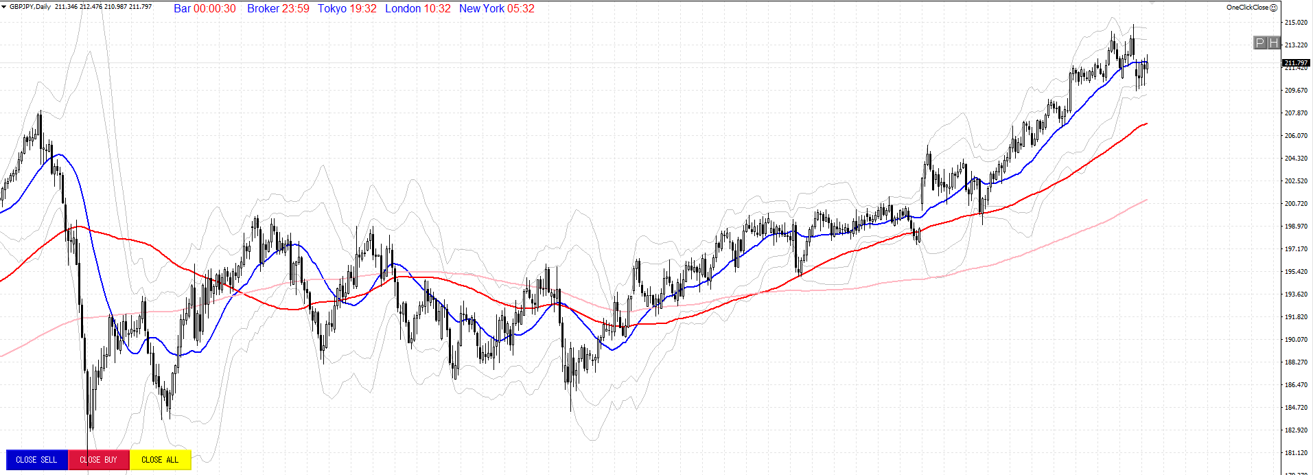 先週の急落により、一段階下でレンジ相場を形成していたポンド円ですが、4時間足を見てみると、一週間かけて綺麗なエリオット波動を形成しているようにも見えます。200MAに支えられて更なる下落は耐えているように見えますが、上から75MAが抑えている形状にもなっています。週明け、日足では20MAを超えることができるのかどうか。日足のMACDは勢いが弱まっている形状にもなっています。またさらに週末にはGOLDが一日でかなり下落したため、その影響は市場にどのような影響を与えるのかも注目が必要です。