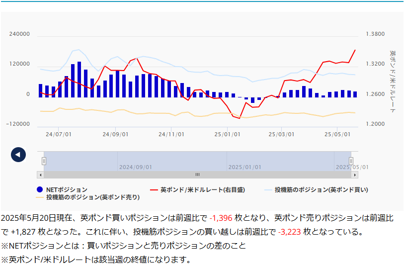 こちらは「外為どっとコム」さんよりお借りしているIMMポジションです。円はドルに対して若干「売り」が先行しているため、ドル円はやはり140円の方向へ下落する可能性が高いことが考えられます。一方、ポンドもドルに対して若干「売り」が先行しているようなので、ポンド/ドルも下方向へ値動きが進む傾向にあるようです。つまり、ポンド円にとっては大きな値動きが期待できそうにないともいえそうです。