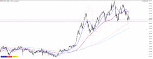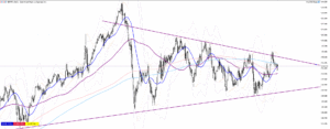 ポンド円も特に変化が無く、週足の大きな三角持ち合いの中を現在は下落傾向の最中となっています。現在は上弦から約1/3程度に陣取っているため、しばらくはもみ合いながら徐々に下弦を目指すと思われます。その中で先述のように、ポンドも円も他通貨よりも強めの状況であるため、この通貨ペアのボラティリティは普段ほど大きくないと考えられます。