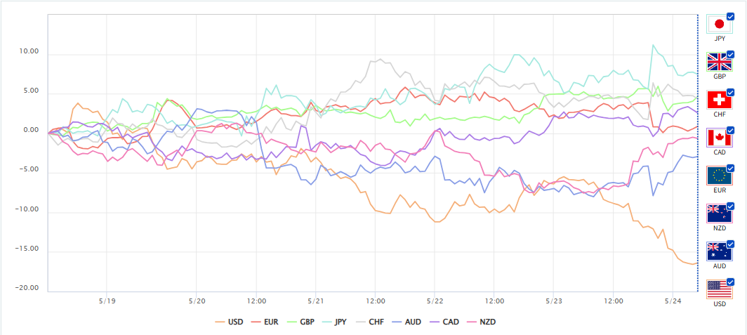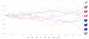 今週はポンド円の値動きがあまりなく、ドル円の値動きの方が大きかった状況です。通貨強弱チャートを見てみると一週間を通して、円とポンドでワンツーフィニッシュという状況であるため、こういった値動きとなったのでしょう。やはり為替は通貨の強弱を見ながらエントリーをするのが最も効率が良いのですが、それを見極めるのも難しいものです。円とポンドが強いという状況が続く限り大きな利益は難しいかもしれません(画像:OANDAさんより)。