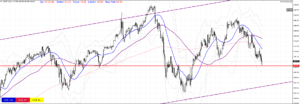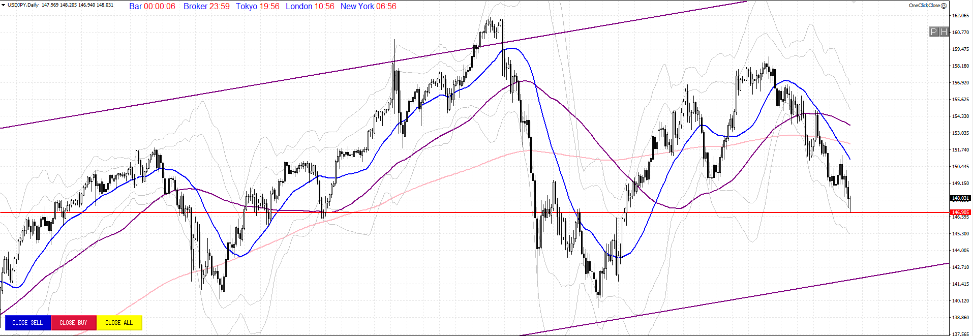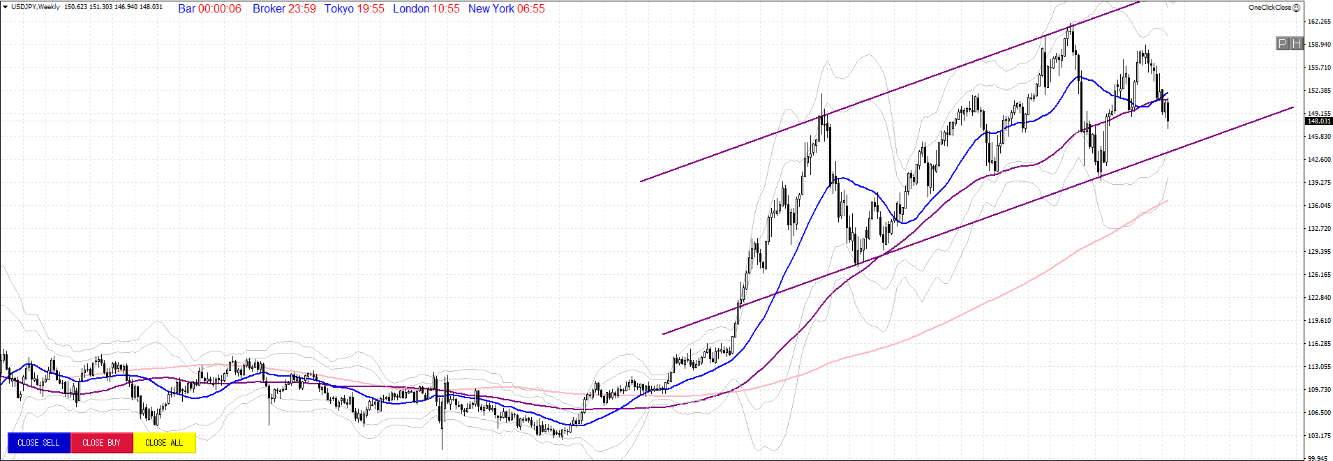 下落傾向にあるといわれているドル円ですが、実は週足で見てみるとトレンドラインがレンジを形成していることがわかります。この週足のトレンドラインを下抜けするためには相当なエネルギーが必要なのは言うまでもありません。