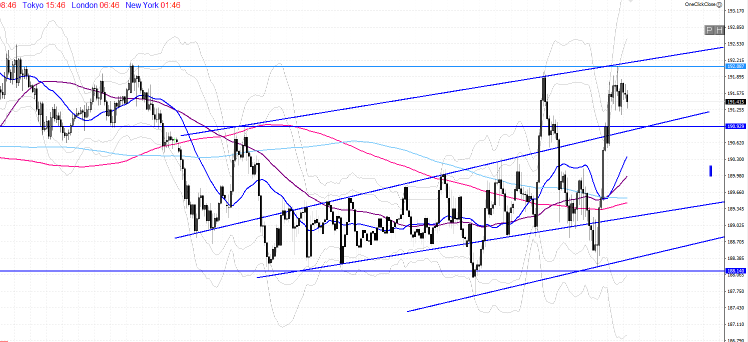 ポンド円は192円を頭に上昇を抑えられてしまいました。そして、そのままヨコヨコというようにレンジを形成しながら時間が経過しています。