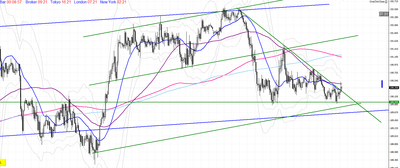 ポンド円のチャートを見ると、190円のところに大きなサポートがあるような状況です。この辺りは「日足のMA」も横たわっており、そのサポートはかなり大きなものと想定されます。そして昨日からの高値をそれぞれ引いたレンジを実体で抜いたところをエントリーチャンスと捉えてのロングでした。